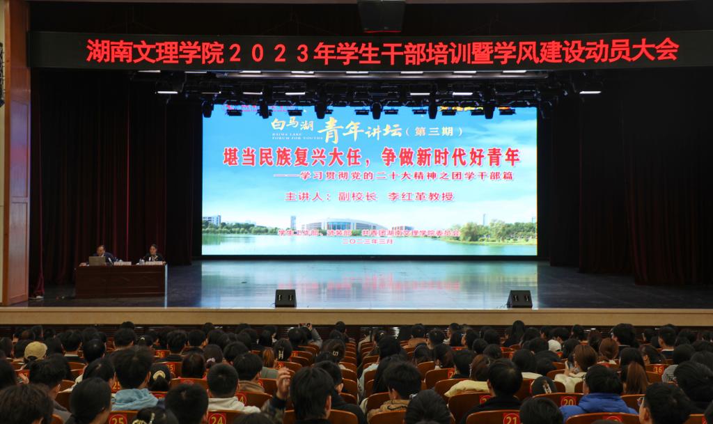 3月28日晚,学校2023年学生干部培训暨学风建设动员大会在艺术中心举行。校党委委员、副校长李红革为千余名学生干部作专题培训。学工部、武装部、团委相关工作人员及全体辅导员参加培训。培训由校团委书记胡婷主持。