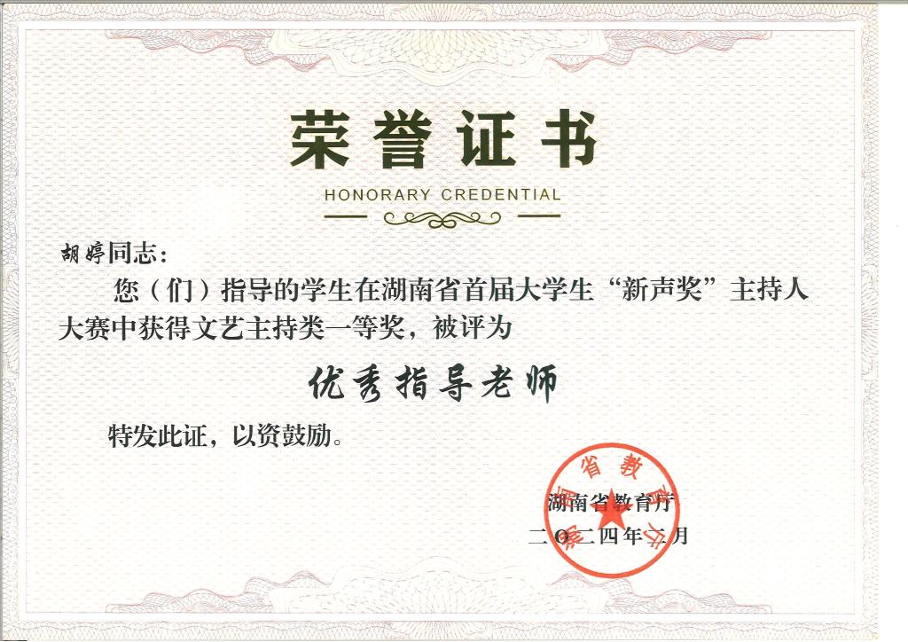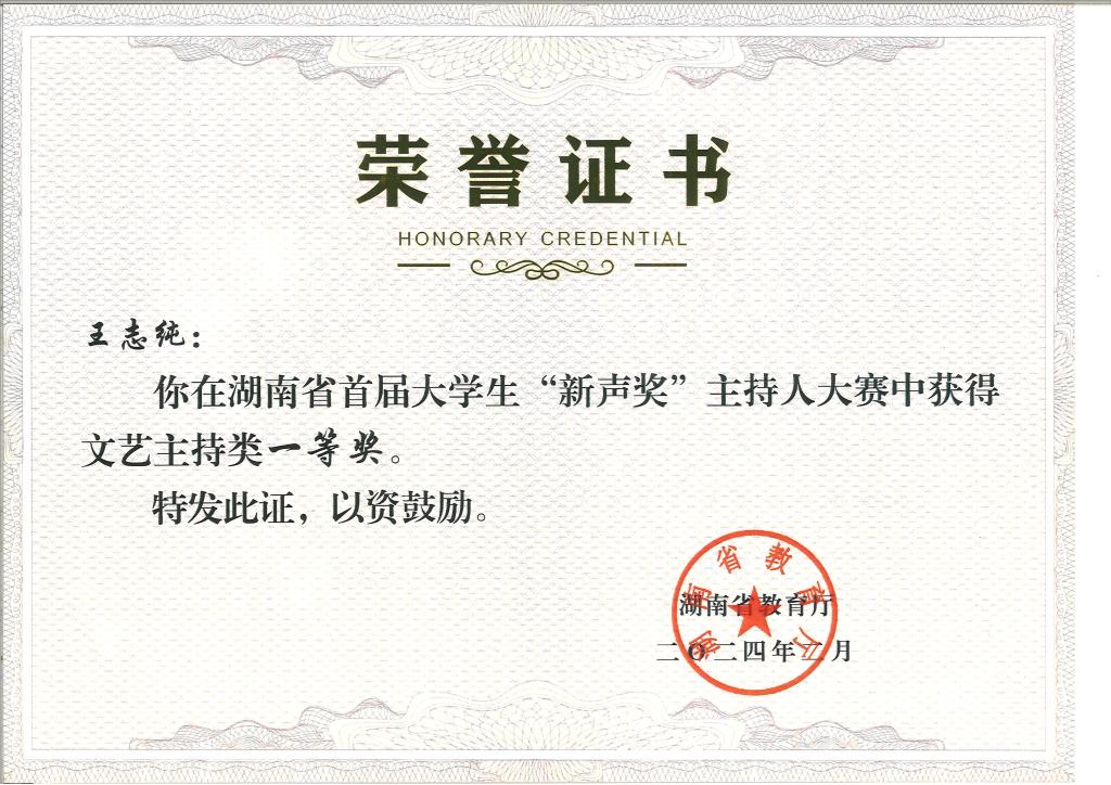 近日,由中共湖南省委教育工委、湖南省教育厅主办的湖南省首届大学生“新声奖”主持人大赛获奖名单公布:我校文史与法学学院王志纯同学获文艺主持类一等奖,胡婷老师获评优秀指导老师。