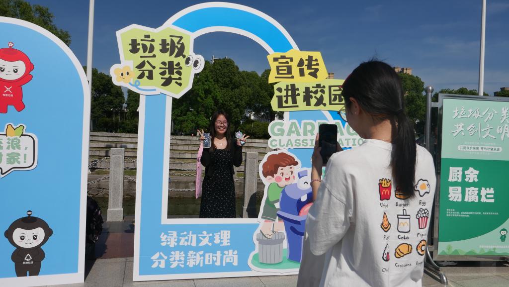 活动现场,音乐舞蹈学院和体育学院的同学们带来了精彩的歌舞表演;游戏互动环节,“垃圾投掷大擂台”模拟真实分类场景,学生们化身“分类高手”,快速辨别可回收物、有害垃圾、厨余垃圾、其他垃圾,并精准投递;“分类姿势快闪”将垃圾分类知识融入身体动作,以趣味形式强化记忆。最火爆的可回收物市集,以旧书本0.7元/斤、旧衣物0.4元/斤的明码标价回收废旧闲置物品,让“变废为宝”从口号变成看得见的实惠。此外,与垃圾分类卡通形象合影集赞兑换礼品的互动,让学生们成为环保宣传“主力军”,将知识传递到社交平台。