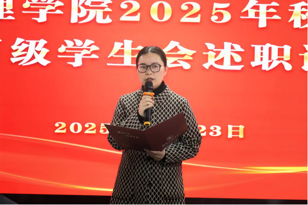 12月23日下午,我校2025年秋季学期校院两级学生会述职评议会在实训楼A304报告厅举行。团委副书记周娟丽出席会议并讲话,团委全体工作人员,各二级学院团总支(分团委)负责人、校学生会主席团成员及各部门部长,团学组织负责人代表,各学院学生分会主席及学生代表参加会议。校学生会主席刘君豪主持会议。