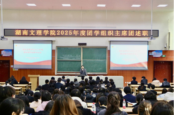 (图片 陈咏宜)为全面总结2025年度团学组织工作成效,进一步强化学生干部责任意识与履职能力,推动团学工作高质量发展,1月16日上午,湖南文理学院2025年度团学组织学生干部述职评议会在西附楼D103教室举行。校团委、校学生会、新媒体中心、学生社团管理中心、青年志愿者协会五大团学组织负责人代表本组织作年度工作述职,团委全体工作人员、全体团学组织学生干部参会。